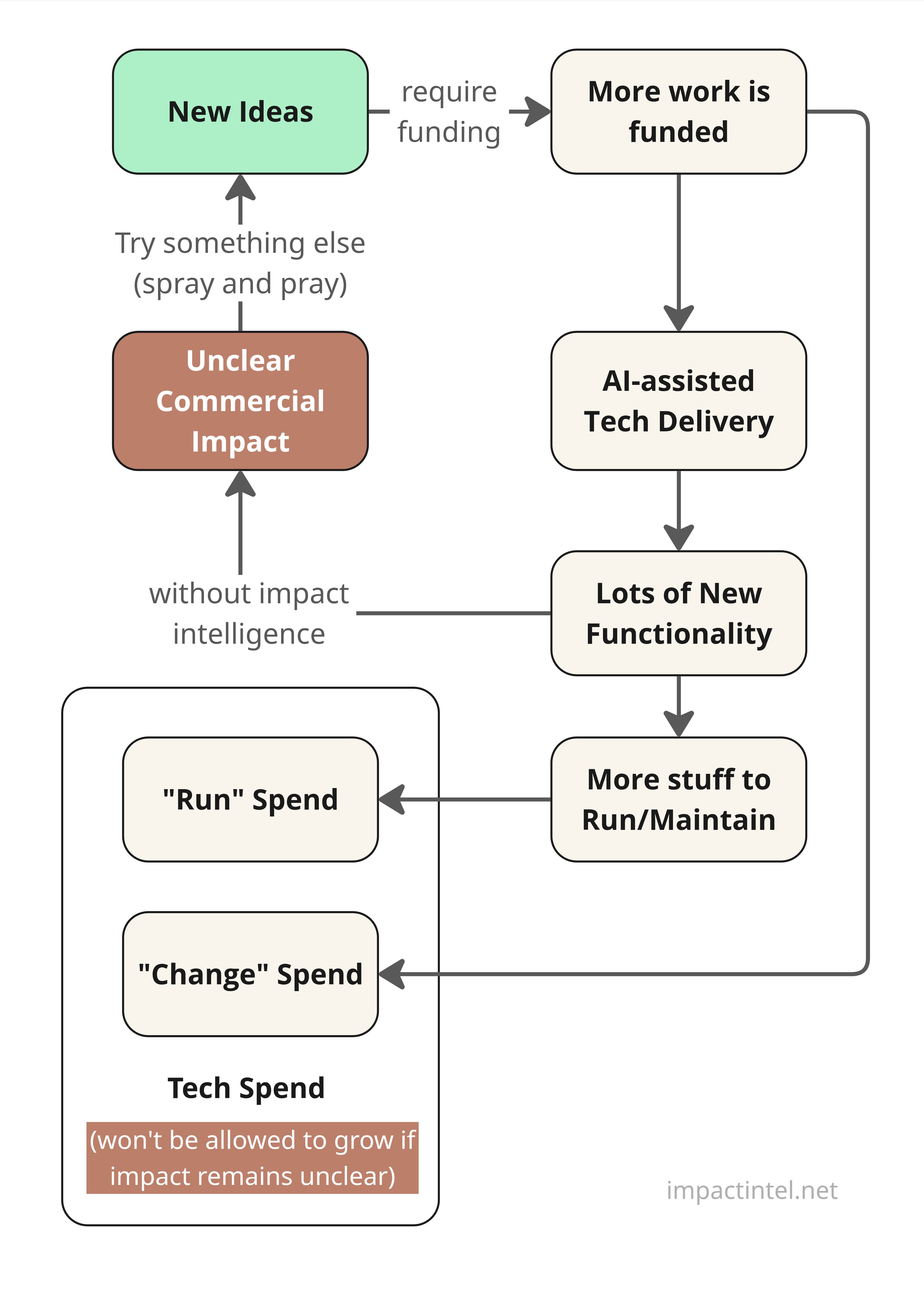The increasing use of AI for product development makes impact intelligence even more relevant. As teams churn out functionality at an ever faster pace, the problem highlighted in Figure 1 becomes existential. As the volume of functionality to be maintained swells, a greater proportion of tech spend will need to be diverted away from new innovation. The overall pie (tech budget) won't grow unless your stakeholders agree that the expenditure pays off in terms of positive business impact.