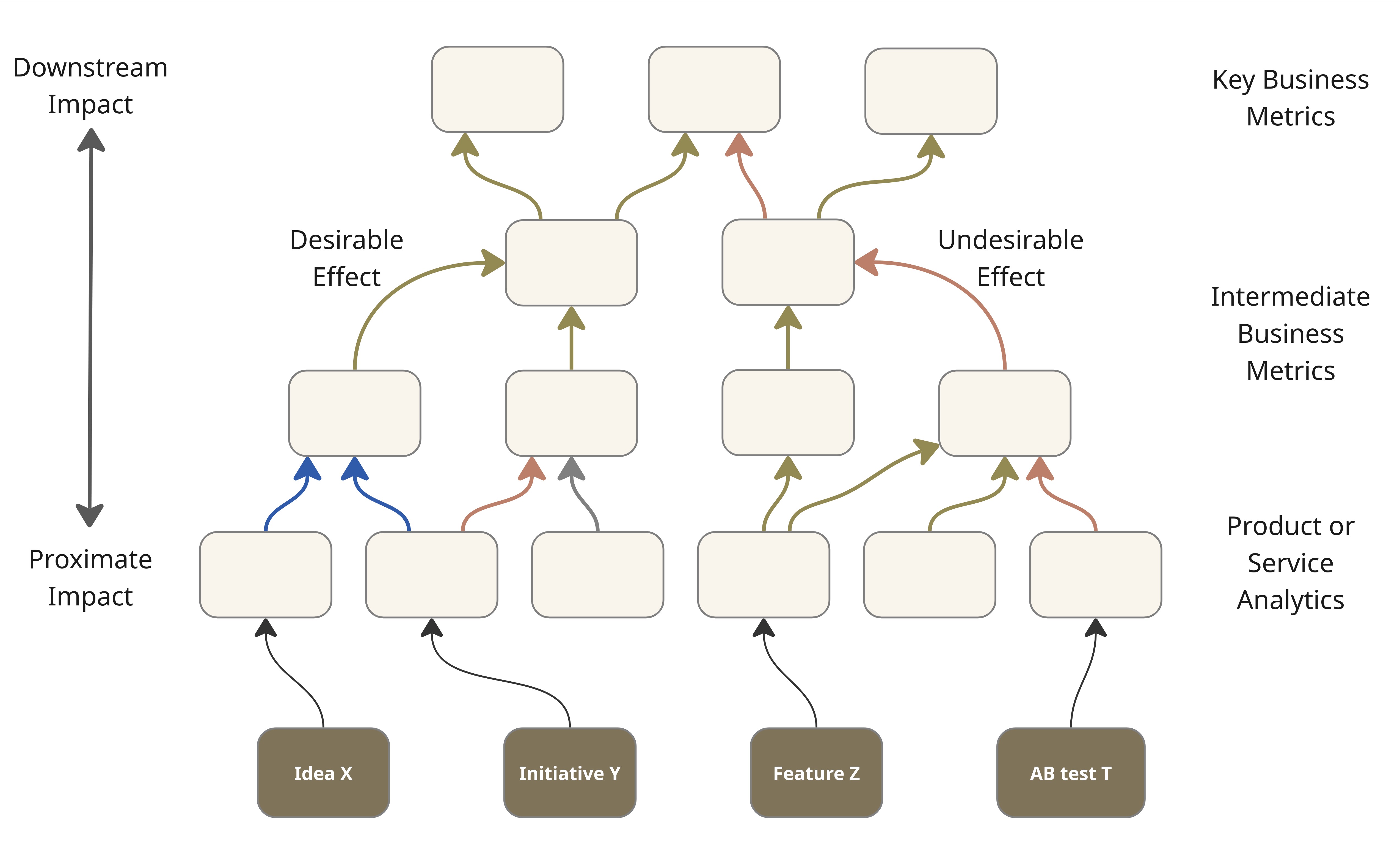 The bottom row of features, initiatives etc. is a temporary overlay on the impact network which, as noted earlier, is basically a KPI tree where every node is a metric or something that can be quantified. I say temporary because the book of work keeps changing while the KPI tree above remains relatively stable.
