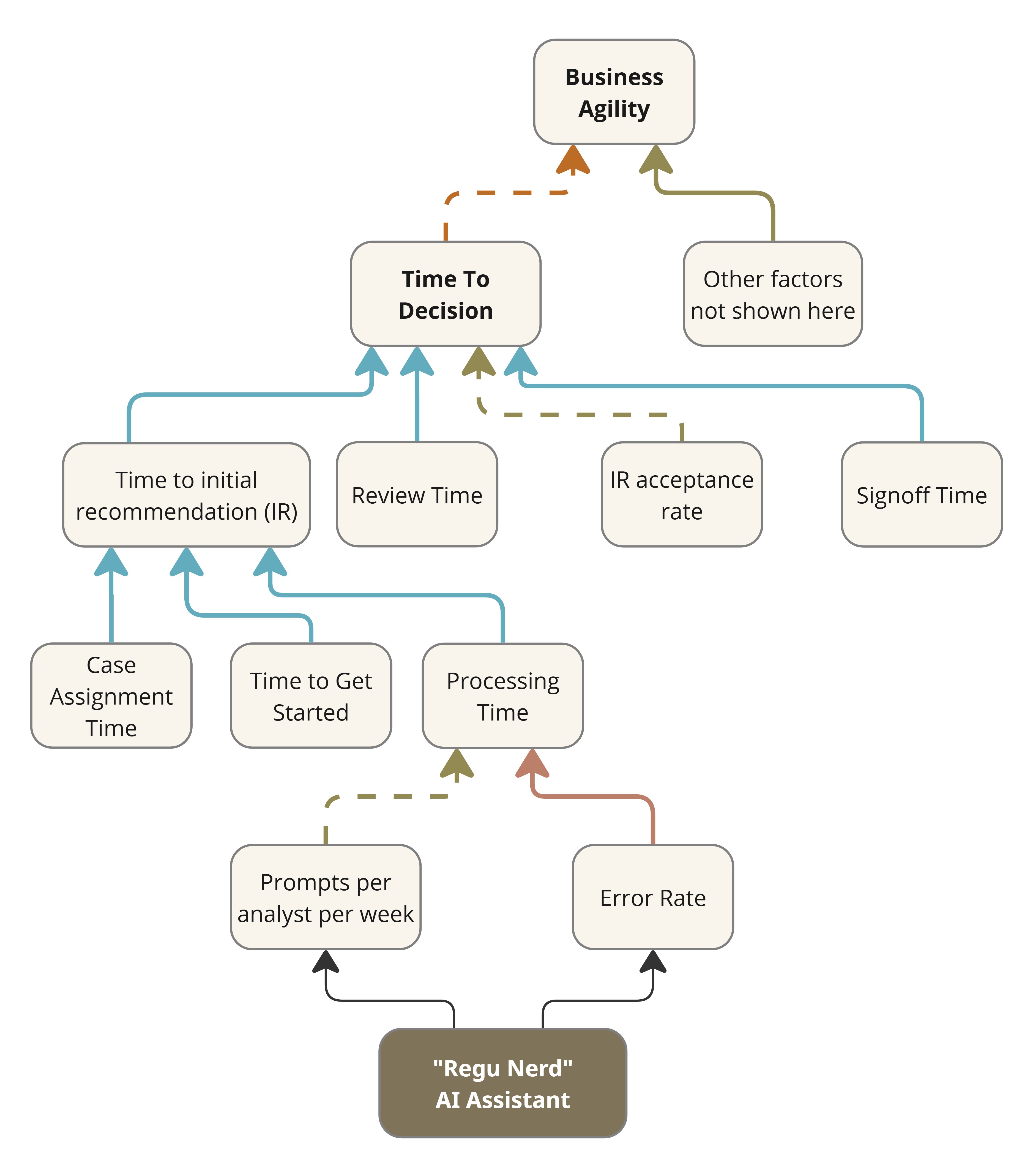 Its proximate impact may be reported in terms of the uptake of the assistant (e.g., prompts per analyst per week), but it is more meaningful to assess the time saved by analysts while processing a case. Any real business impact would arise from an improvement in Time to Decision. That’s downstream impact, and it would only come about if the assistant were effective and if the Time to initial recommendation were indeed the bottleneck in the first place.