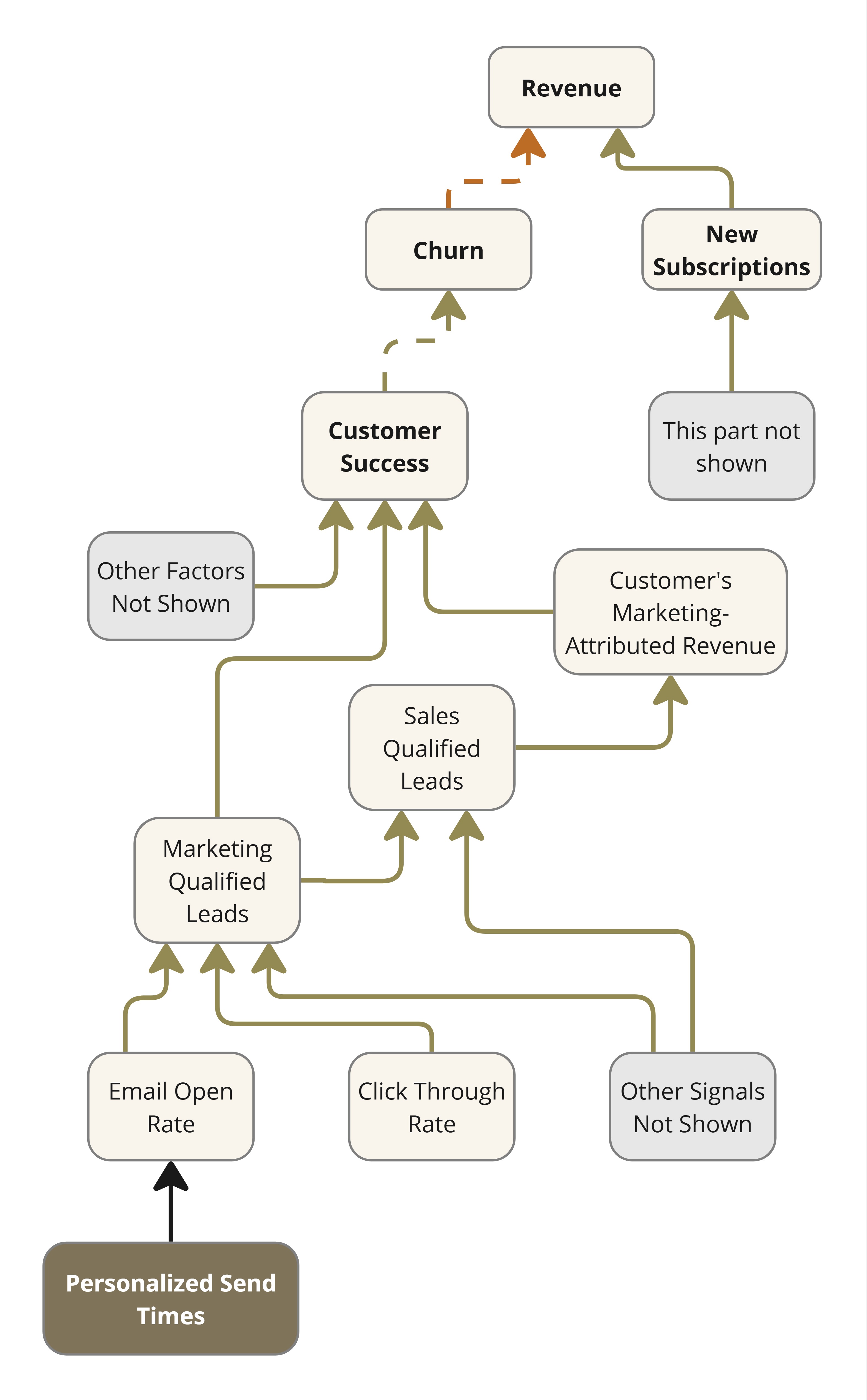 Consider a SaaS business that offers an email marketing solution. Their revenue depends on new subscriptions and renewals. Renewal depends on how useful the solution is to their customers, among other factors like price competitiveness. Figure 5 shows the relevant section of their impact network.
