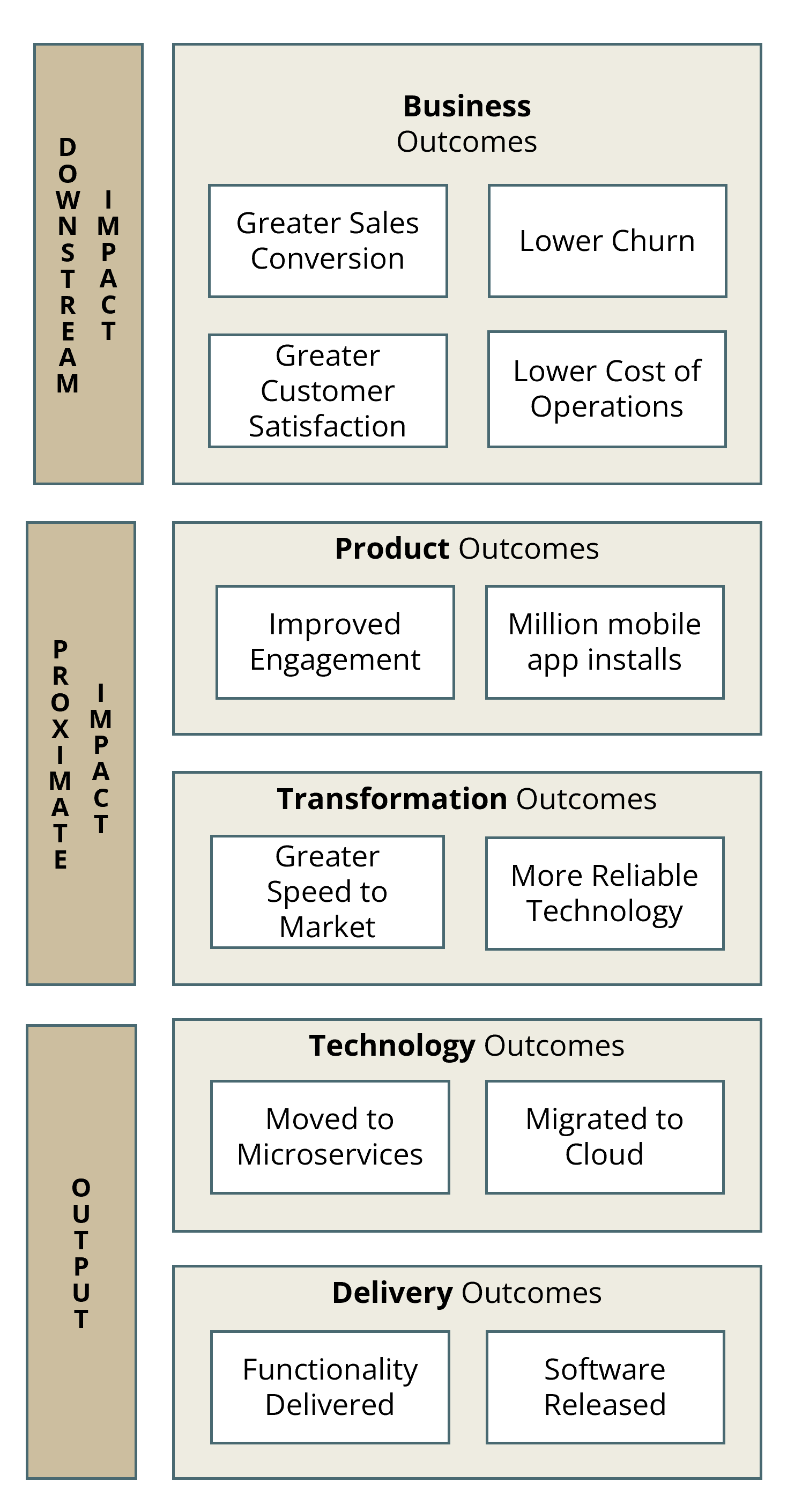 It can feel lonely if you are the only senior exec advocating for greater impact intelligence. But you don’t have to run a solo campaign. Help your teams understand the big picture and rally them around to your cause. Help them appreciate that product development does not automatically imply business impact. Even feature adoption does not. Start by helping them understand the meaning of business impact in different contexts. I have found it useful to explain this with an illustration of a hierarchy of outcomes as in Figure 8 The ones at the top are closest to business impact. The lower-level outcomes might support or enable the higher-level outcomes, but we should not take that for granted. Impact intelligence is about tracking that the supposed linkages work as expected. When your teams internalize this hierarchy, they’ll be able to help you improve demand management even more. They’ll begin to appreciate your nudges to reduce measurement debt. They’ll start asking their business colleagues and leaders about the business impact of functionality that was delivered.